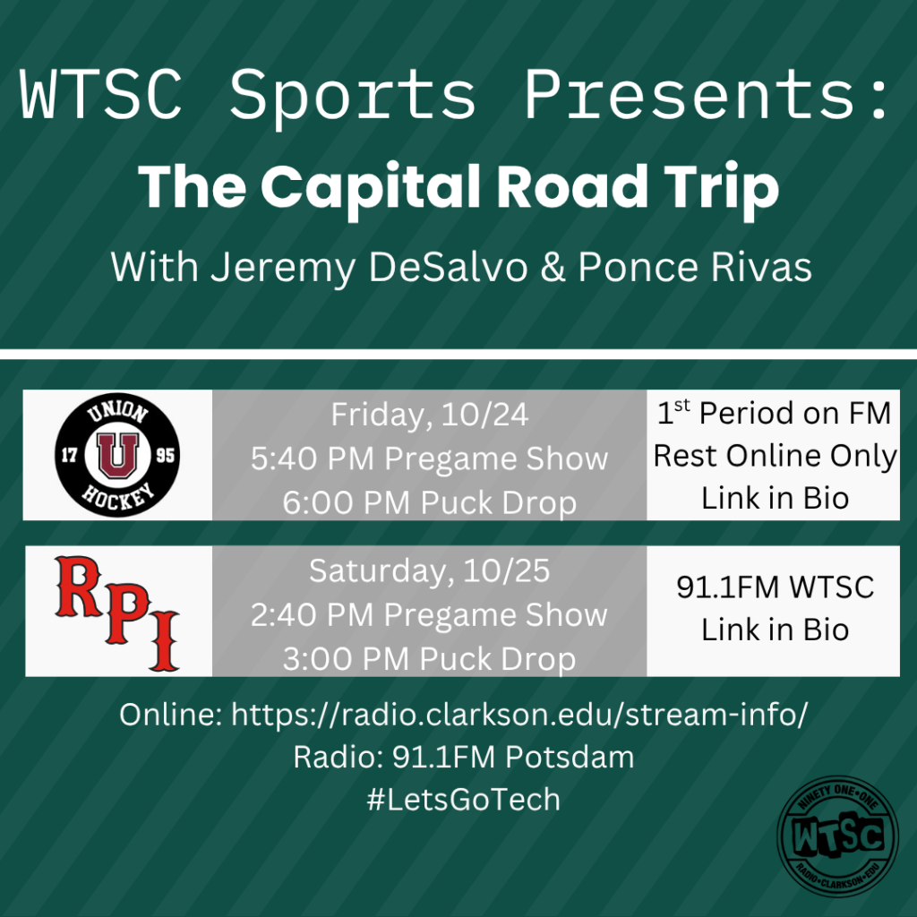 WTSC Sports is headed to the Albany area to cover the Women’s Hockey games this weekend. Clarkson will play on Friday Night at 6:00PM against Union. Our coverage will begin at 5:40PM with the Pregame Show. The broadcast will end on 91.1 FM following the first period to make way for the Men’s Hockey game back at Cheel, but we will continue calling the game on the Sports Extra Feed. We are back in action on Saturday Afternoon for the first leg of a Clarkson Hockey Doubleheader. The Women will play RPI at 3:00PM. Our coverage will begin at 2:40PM with the entire game broadcast on 91.1 FM and radio.clarkson.edu/stream-info/. Sports Director Jeremy DeSalvo and Ponce Rivas have you covered for the Women’s games this weekend while Luke Dalton and Natalie Hooper are back in Potsdam for the Men’s Hockey Games against North Dakota.